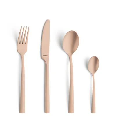 Je kan met Amefa Vintage Austin bestek mooie combinaties maken en een eigen sfeer creëren. Koper is één van de trendkleuren van dit moment. Dit bestek is uitstekend te combineren met allerlei verschillende eettafels en serviessets, waardoor het voor iedereen een passende keuze is! De 16-delige set bestaat uit: 4 tafelmessen, 4 tafelvorken, 4 tafellepels en 4 koffielepels. Zo haal jij je basisbestek in één keer in huis!